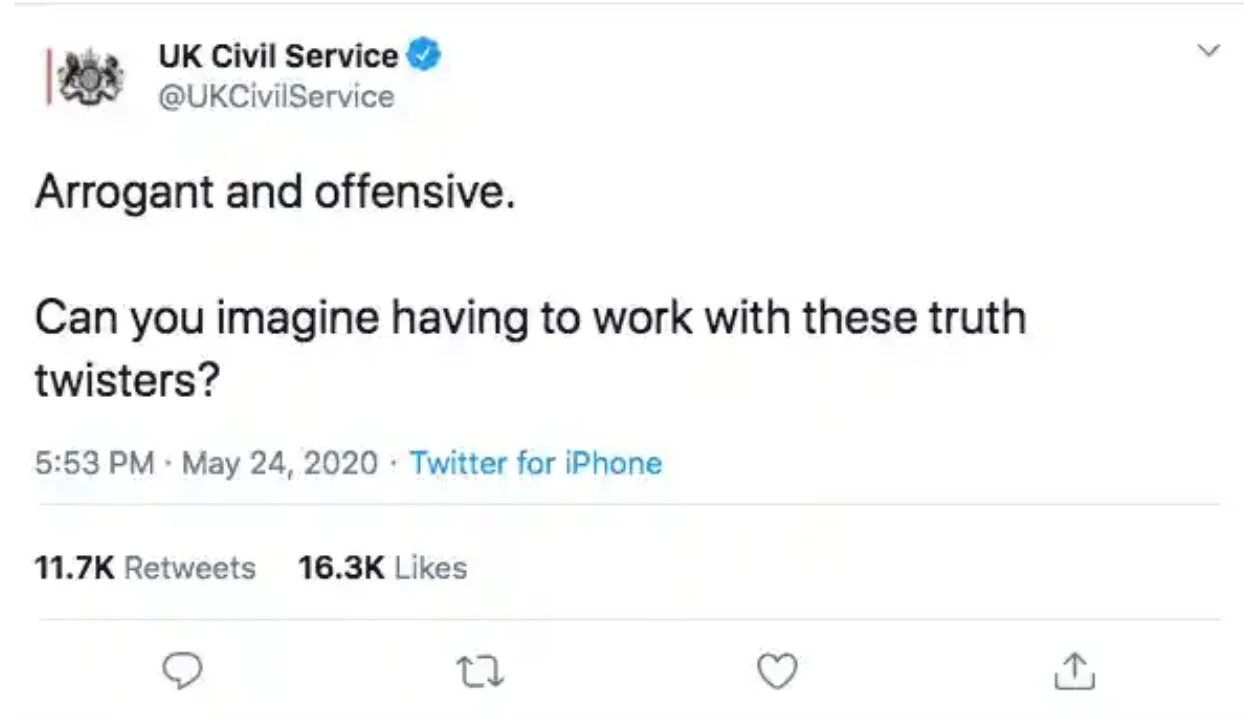 The now iconic Civil Service tweet that cut through the double speak of Boris and cronies and basically petrol bombed neutrality.